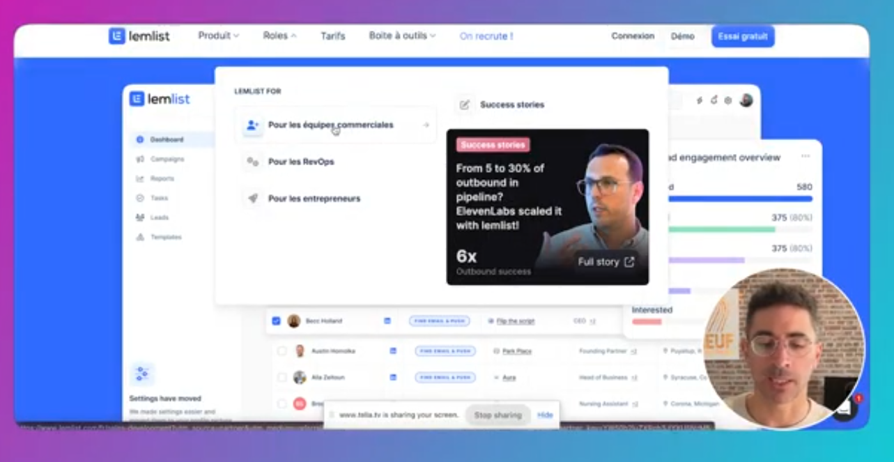 vérifier si l’outil couvre 100% de tes besoins , comprendre les fonctionnalités vraiment utiles , être capable de lancer rapidement tes premières campagnes (puis les analyser proprement). À qui s’adresse Lemlist ? Lemlist se positionne comme une plateforme complète de cold outreach : tu peux quasiment tout faire avec ce canal aujourd’hui.