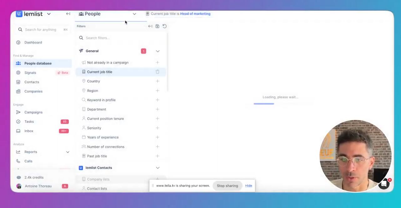 Vue d’ensemble des filtres proposées dans “People database” de Lemlist