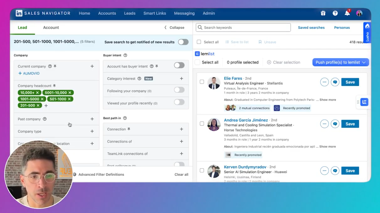 créer tes listes sur Linkedin / Sales Navigator pousser ensuite les profils dans Lemlist via le plugin Chrome Pourquoi ?