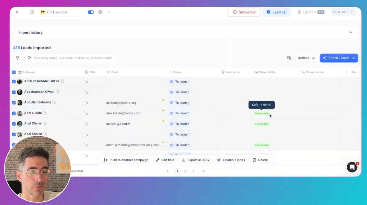vérifier chaque lead (variables bien remplies) filtrer par statut (ex : emails délivrables uniquement) lancer un par un ou en bloc Récapitulatif du messaging pour chaque prospect disponible dans Launch
