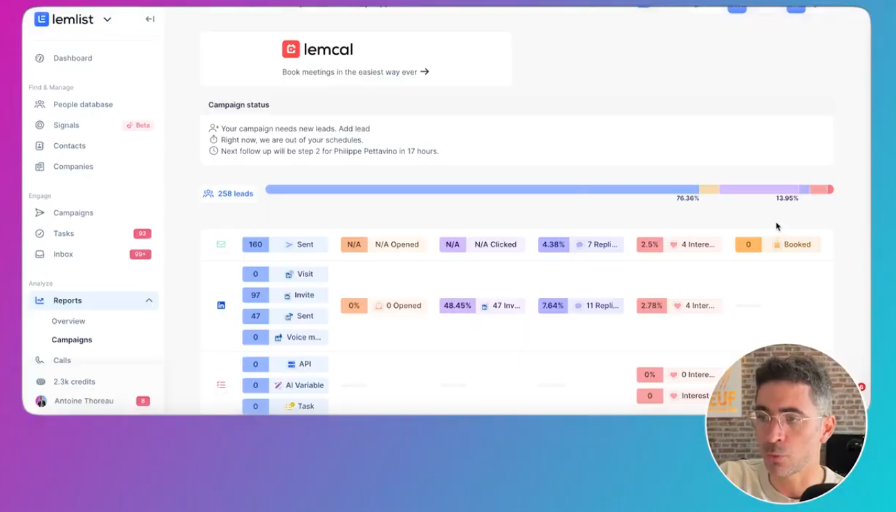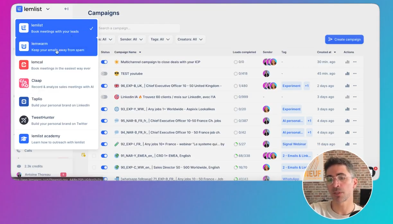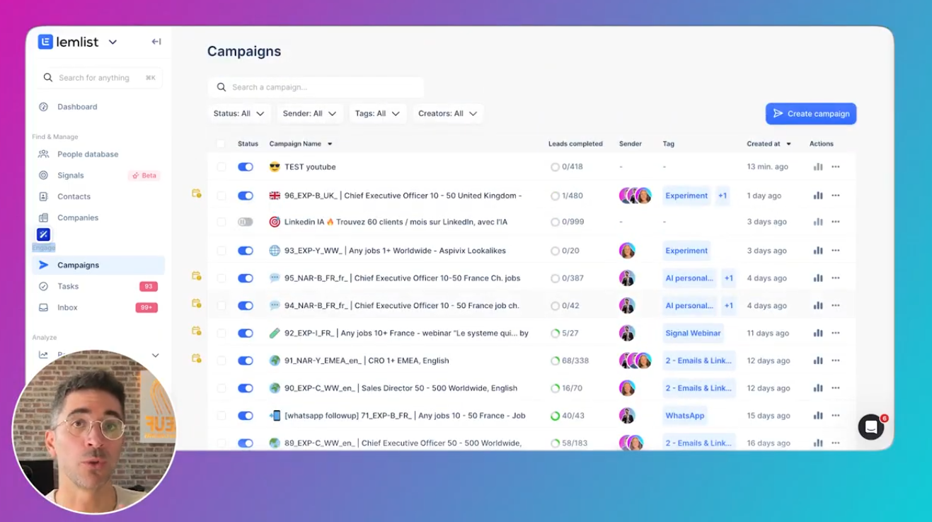 Les campagnes : le cœur de Lemlist Dans Campaigns , tu vois toutes tes campagnes (et leurs métriques).