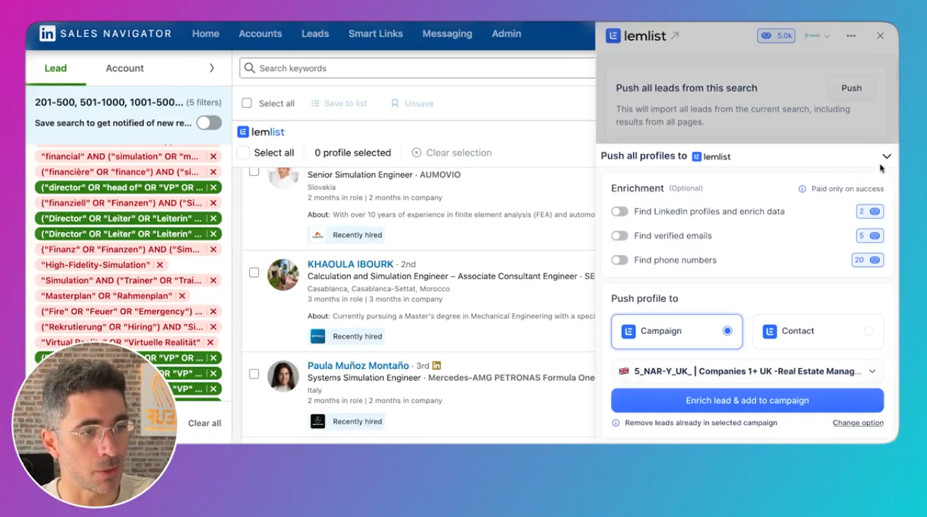 Pousser une recherche Sales Navigator dans Lemlist Quand tu es sur une recherche (Sales Navigator ou LinkedIn) :