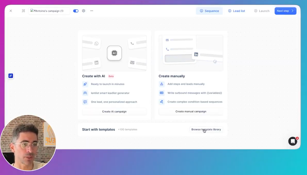 Ici, cas d’une campagne Lemlist créée manuellement