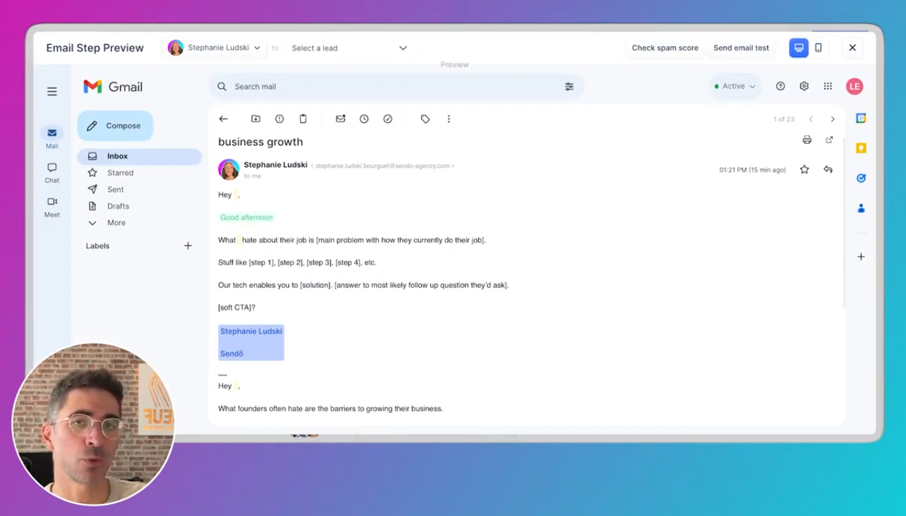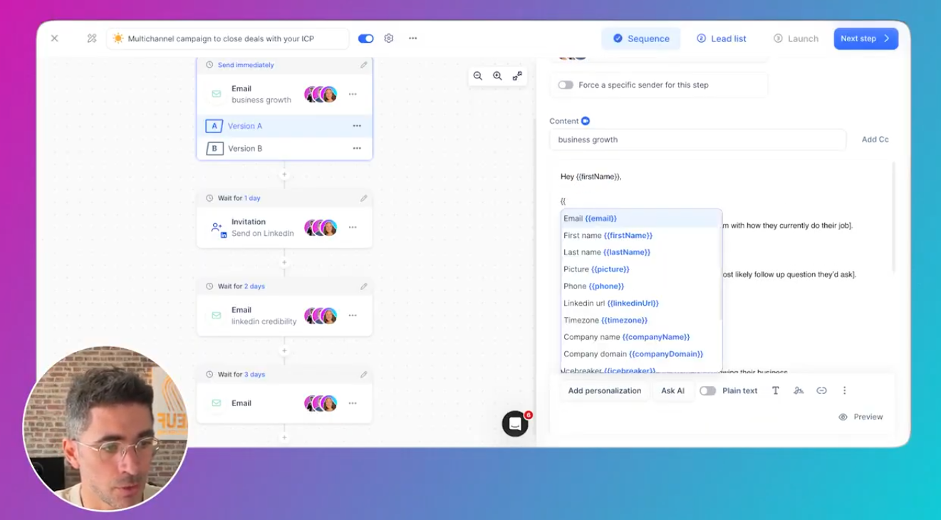 variables en vert signature dynamique possibilité de prévisualiser différents leads Très utile pour éviter les erreurs avant lancement.