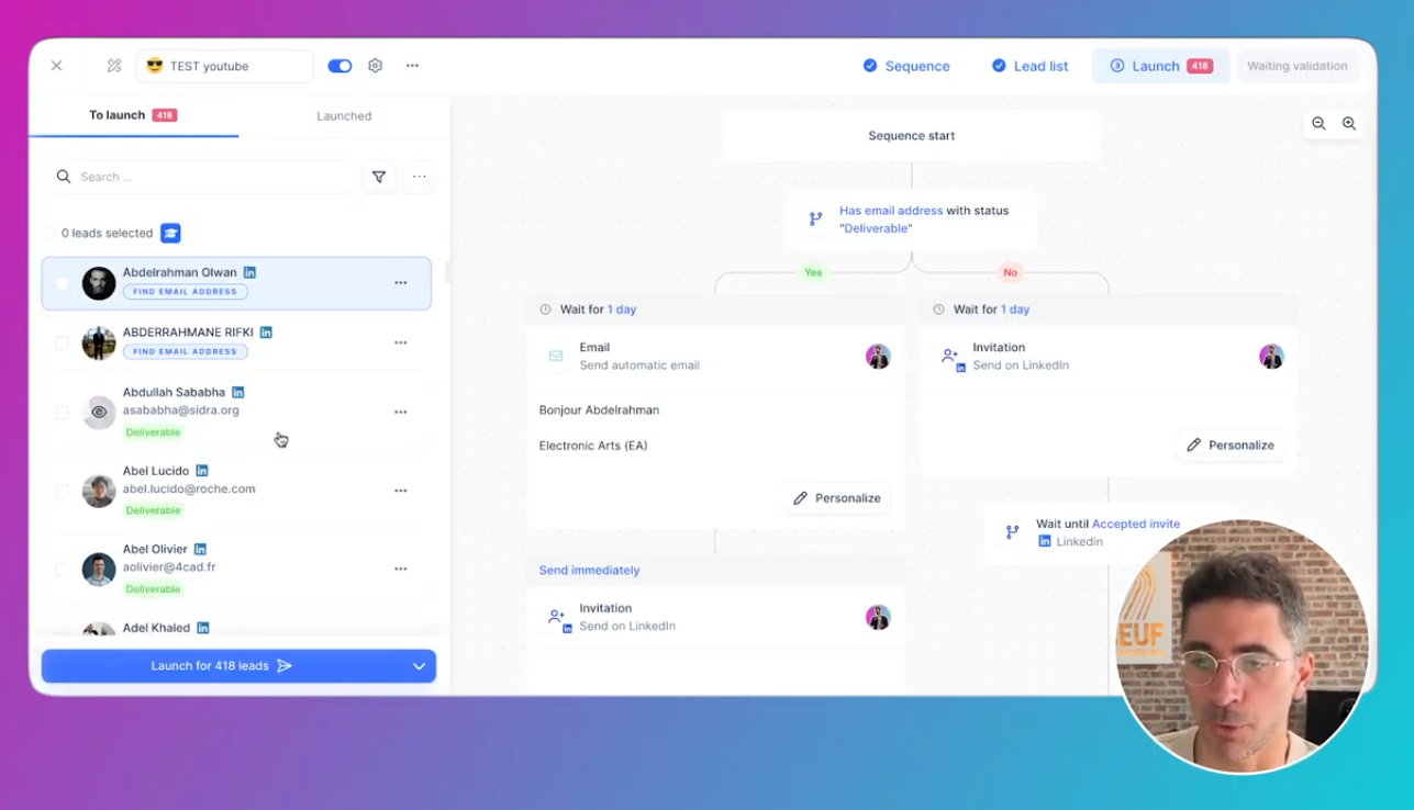 attendre X jours puis brancher “oui/non” ou “attendre jusqu’à acceptation” (mais risque de bloquer beaucoup de leads indéfiniment) Launch : contrôler et lancer proprement Dans Launch / To launch , tu peux :