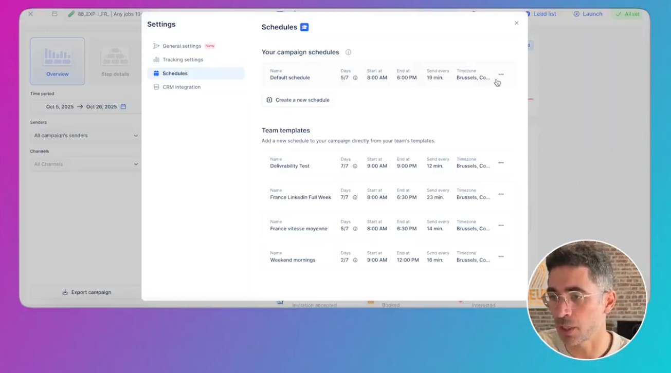 Calendrier d’envoi éviter week-end envoyer sur horaires de bureau vérifier le bon fuseau horaire (sinon envoi la nuit) Aperçu de la fonctionnalité “Schedule” de Lemlist pour paramétrer ton calendrier d’envoi