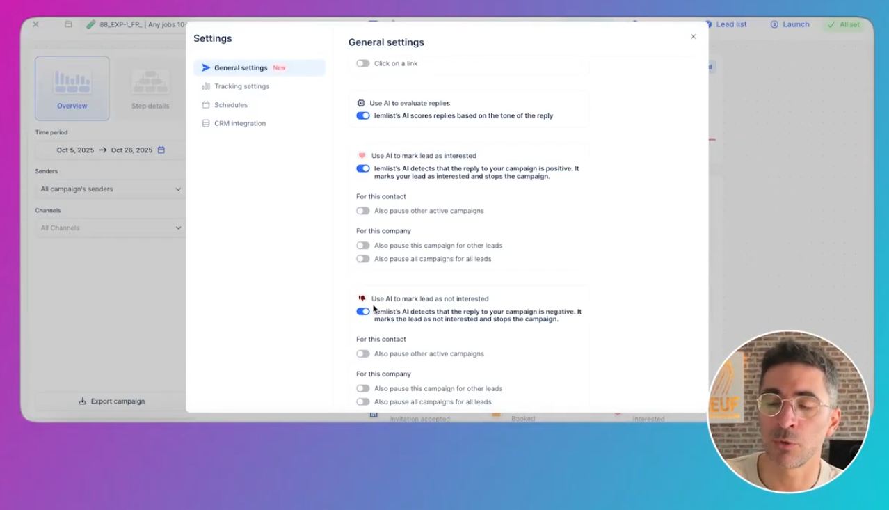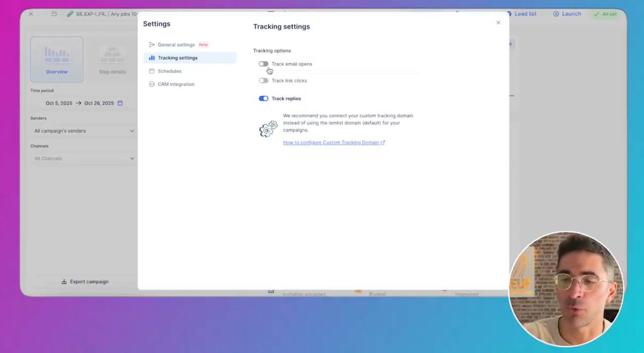 emails envoyés réponses / taux de réponse intéressés invitations LinkedIn envoyées taux d’acceptation taux de réponse LinkedIn calls (si activé) ⚠️ Note : si tu désactives tracking open/clic, ces chiffres ne veulent plus rien dire (normal).