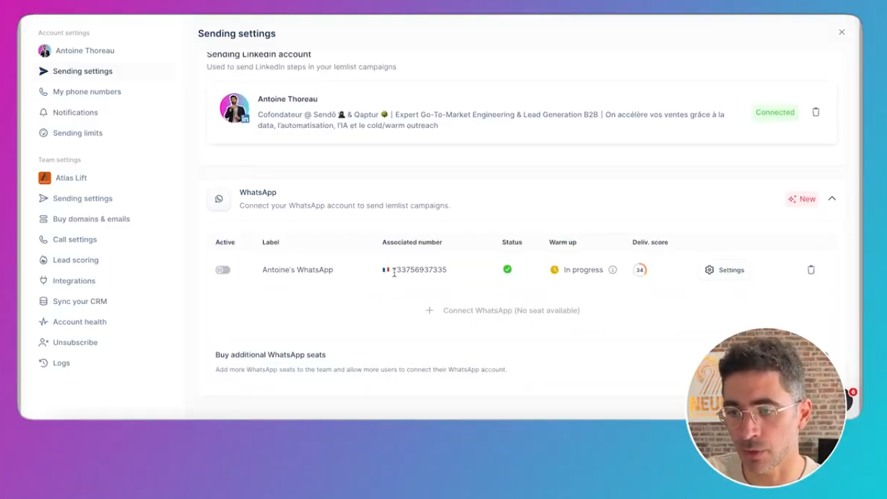 Connecter les senders : emails, LinkedIn, WhatsApp, Calls Emails Selon ton plan, tu peux connecter plusieurs inbox.