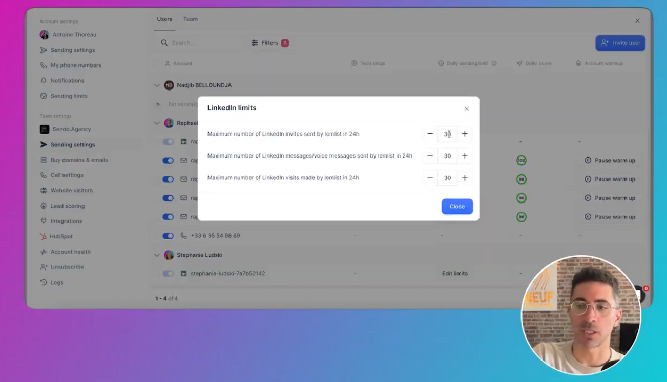 Très important : les limites journalières Quand tu connectes une inbox, Lemlist peut proposer une limite par défaut (trop haute).