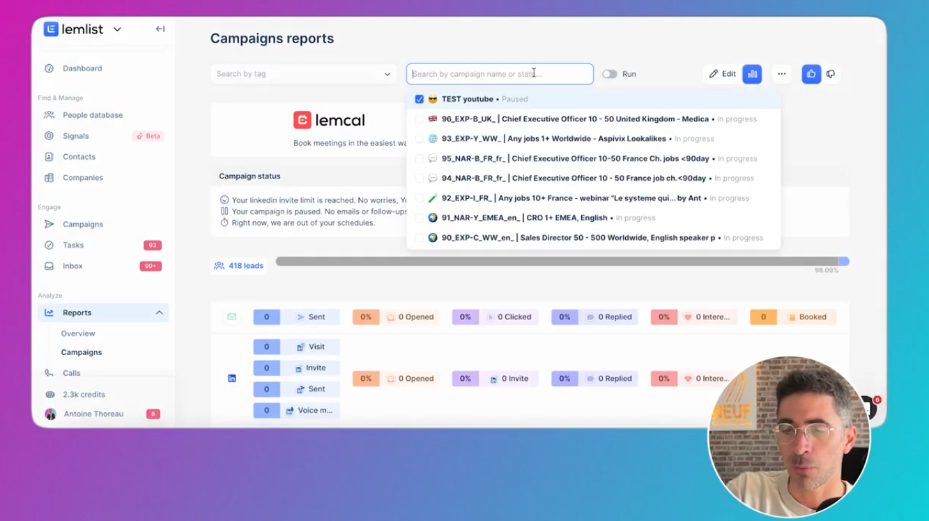 Reporting : analyser ce qui marche Campaigns Aperçu de la fonctionnalité “Campaigns reports” de Lemlist