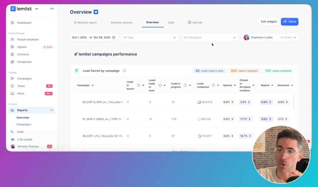 Vue d’ensemble de la fonctionnalité “Overview” dans “Reports” de Lemlist